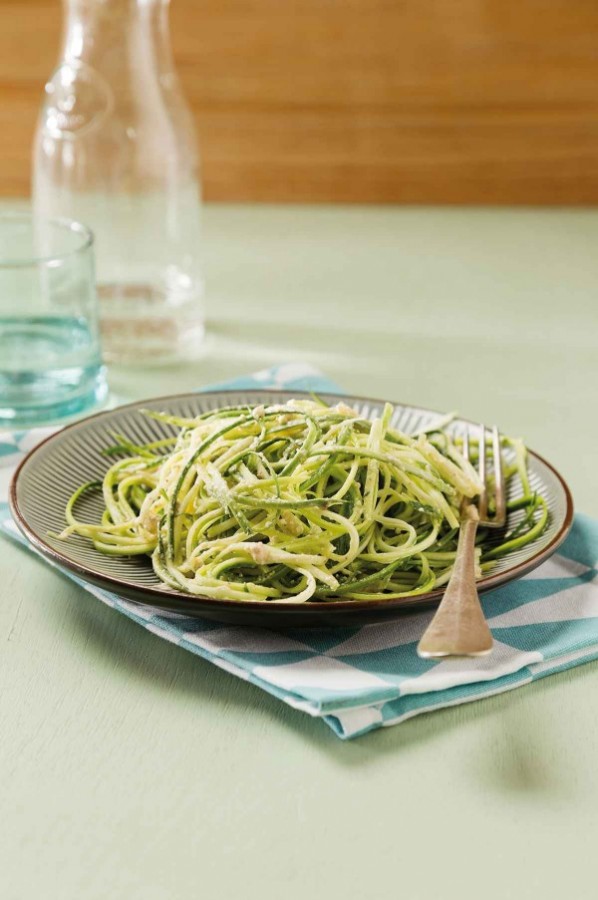 2 middelgrote courgettes, in heel dunne sliertjes gesneden (‘spaghetti’), gebruik hiervoor bijvoorbeeld een Spirooli (een speciale raspmachine) of een juliennesnijder