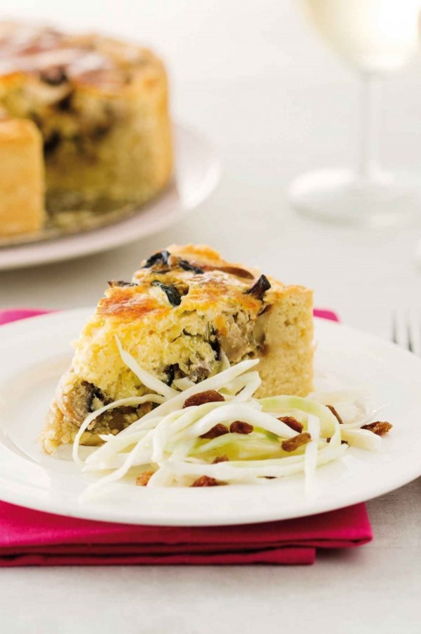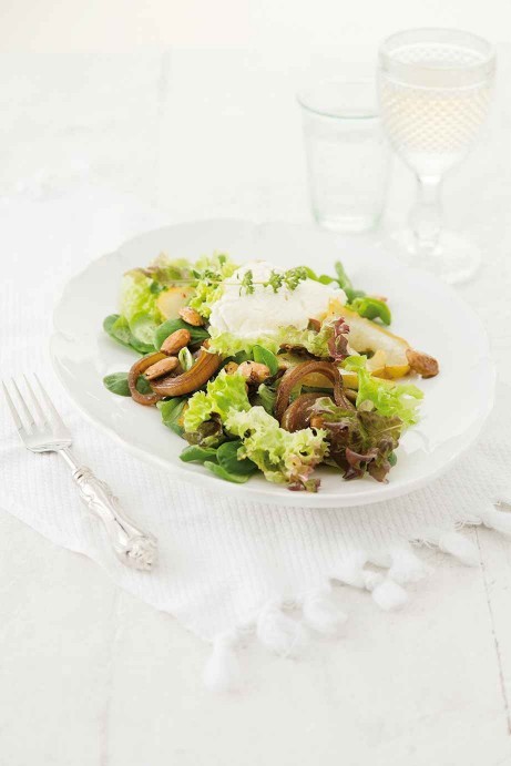 met shiitake, truffel en lente-ui met appel-koolsalade